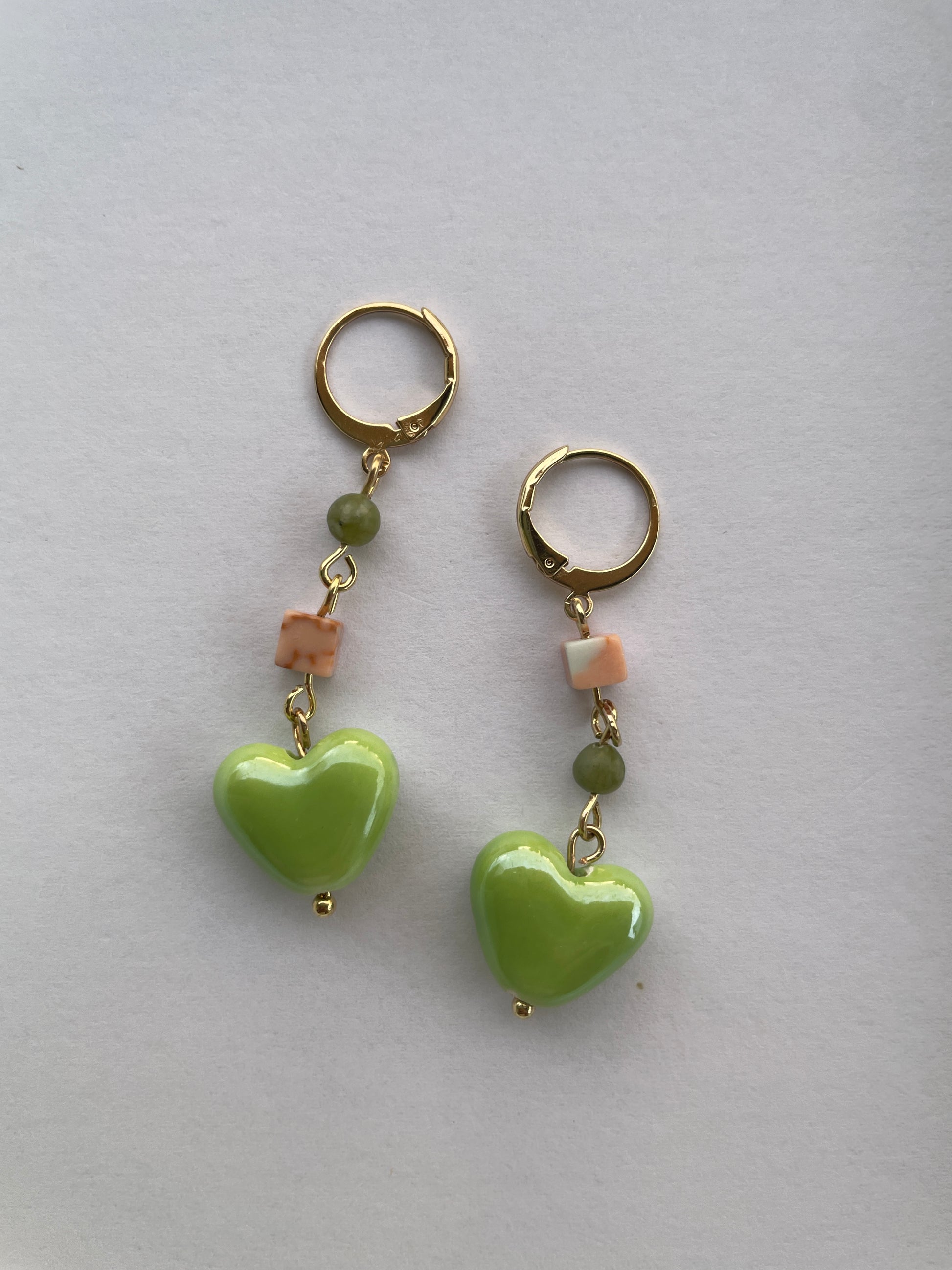 Gold plated upcycled drop earrings out of little ceramic heart beads combined with gemstones and natural stones.