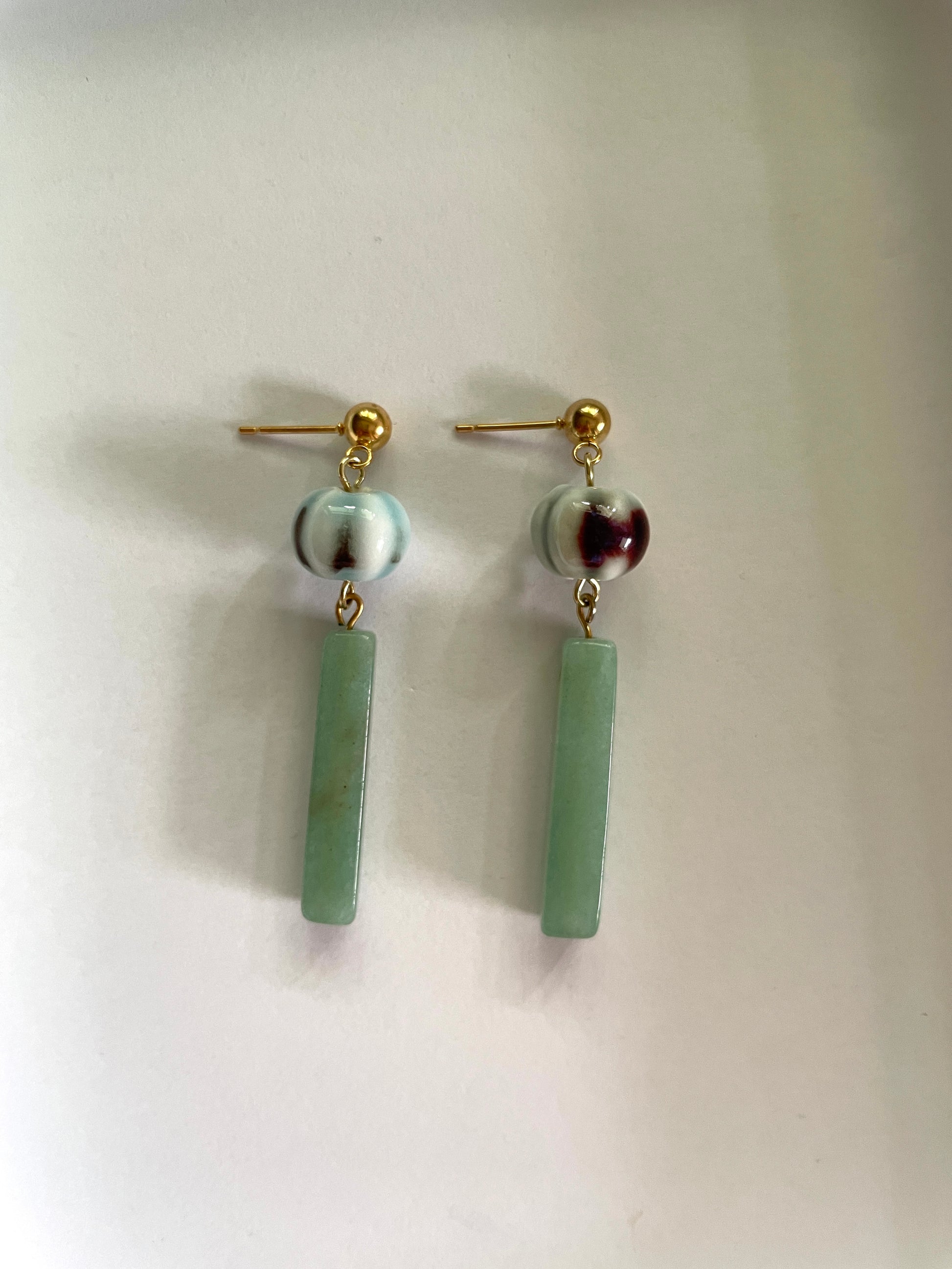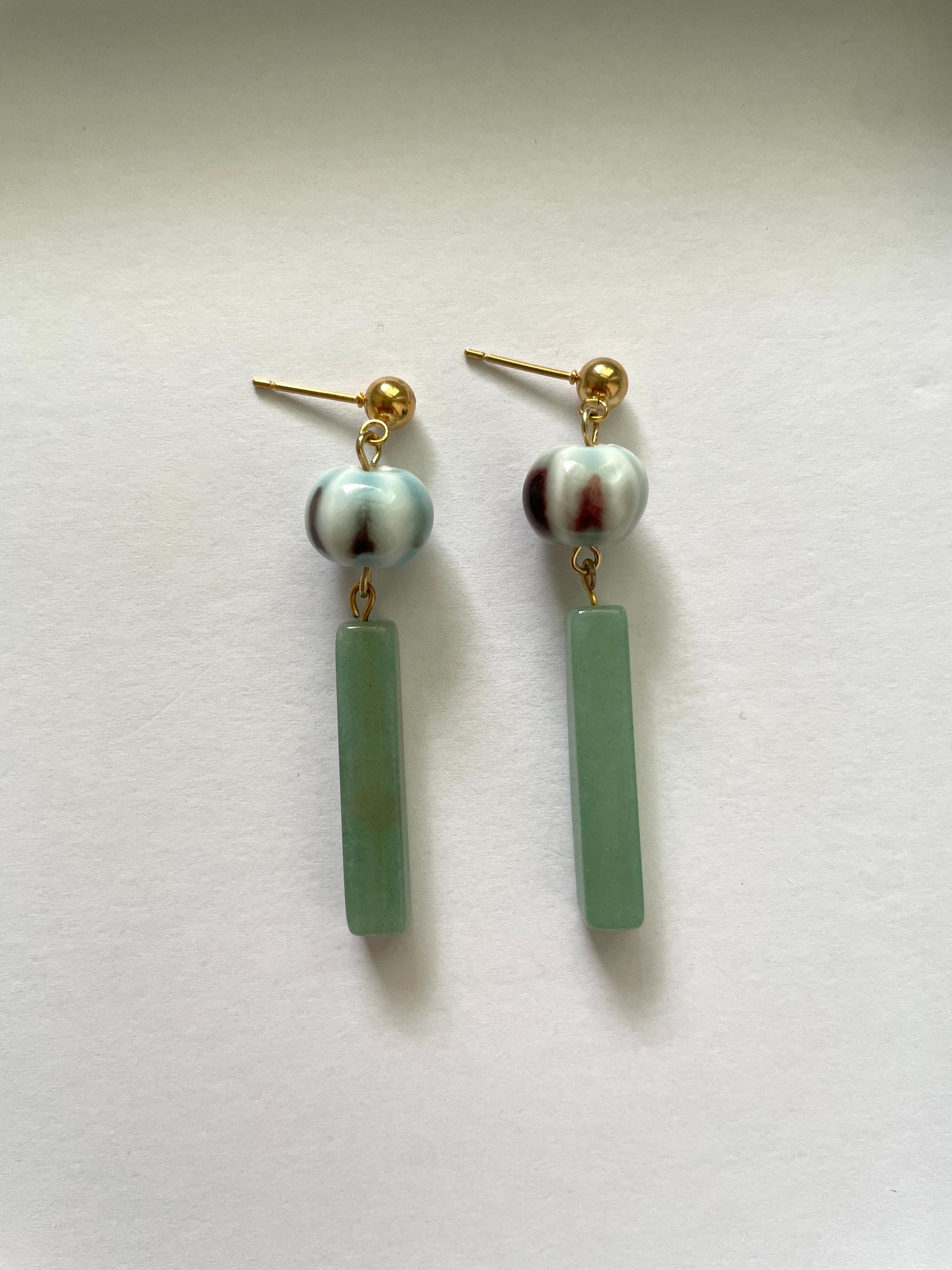 Drop earrings out of ceramic beads combined with a long geometric emerald gemstone.