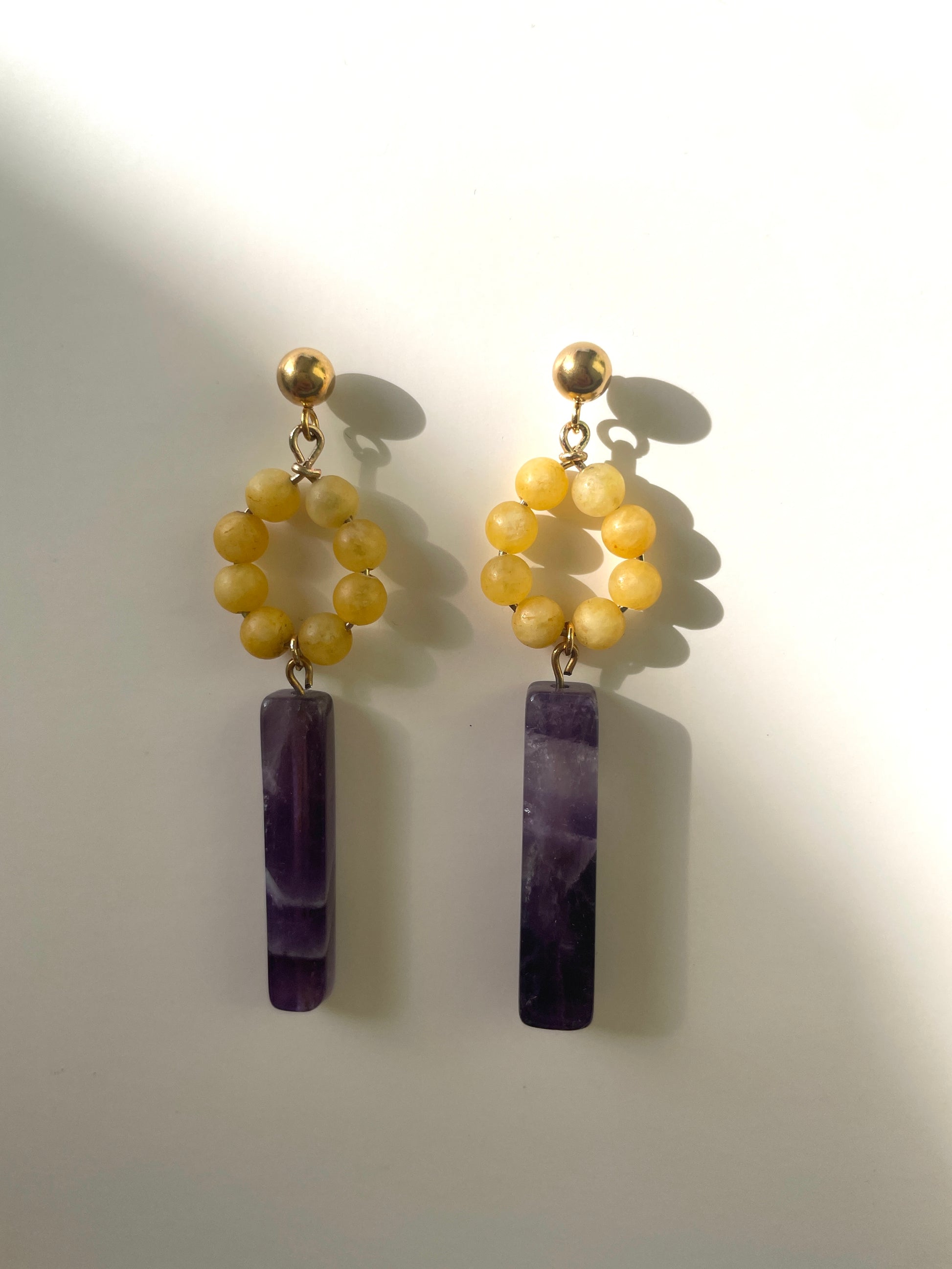 Drop earrings out of round yellow nature stone beads combined with a long geometric violet gemstone.