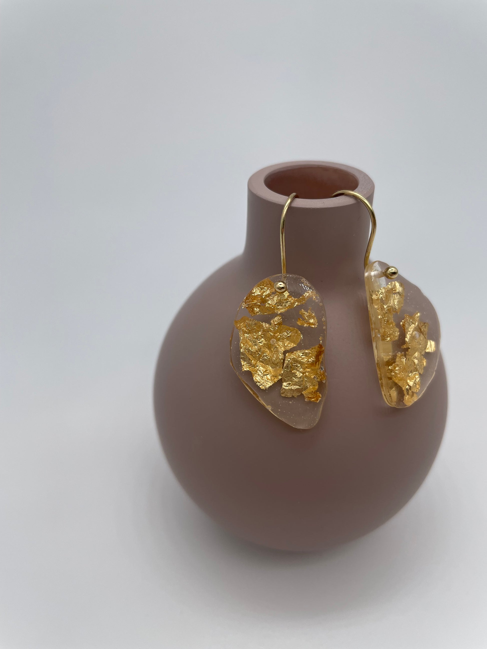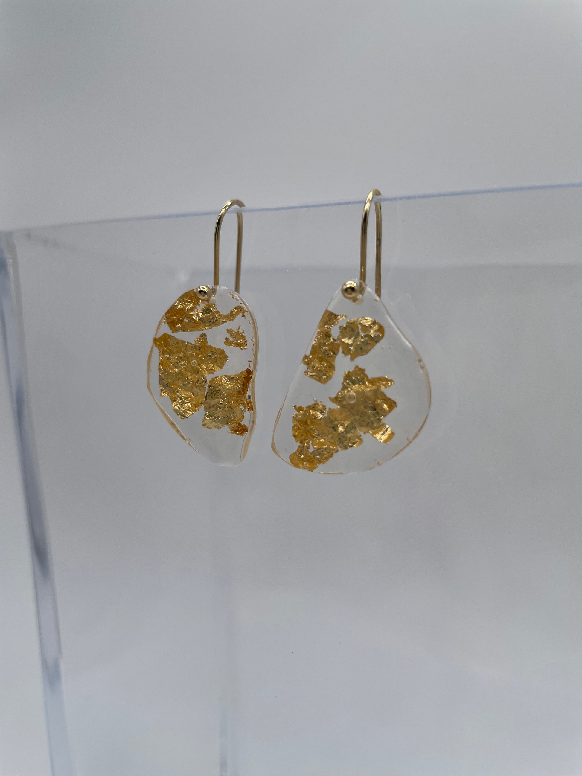 Soft shaped organic earrings are handmade out of transparent resin mixed with golden flakes in a organic shape. The organic resin shapes are handmade and each one is different, they are formed without molds.