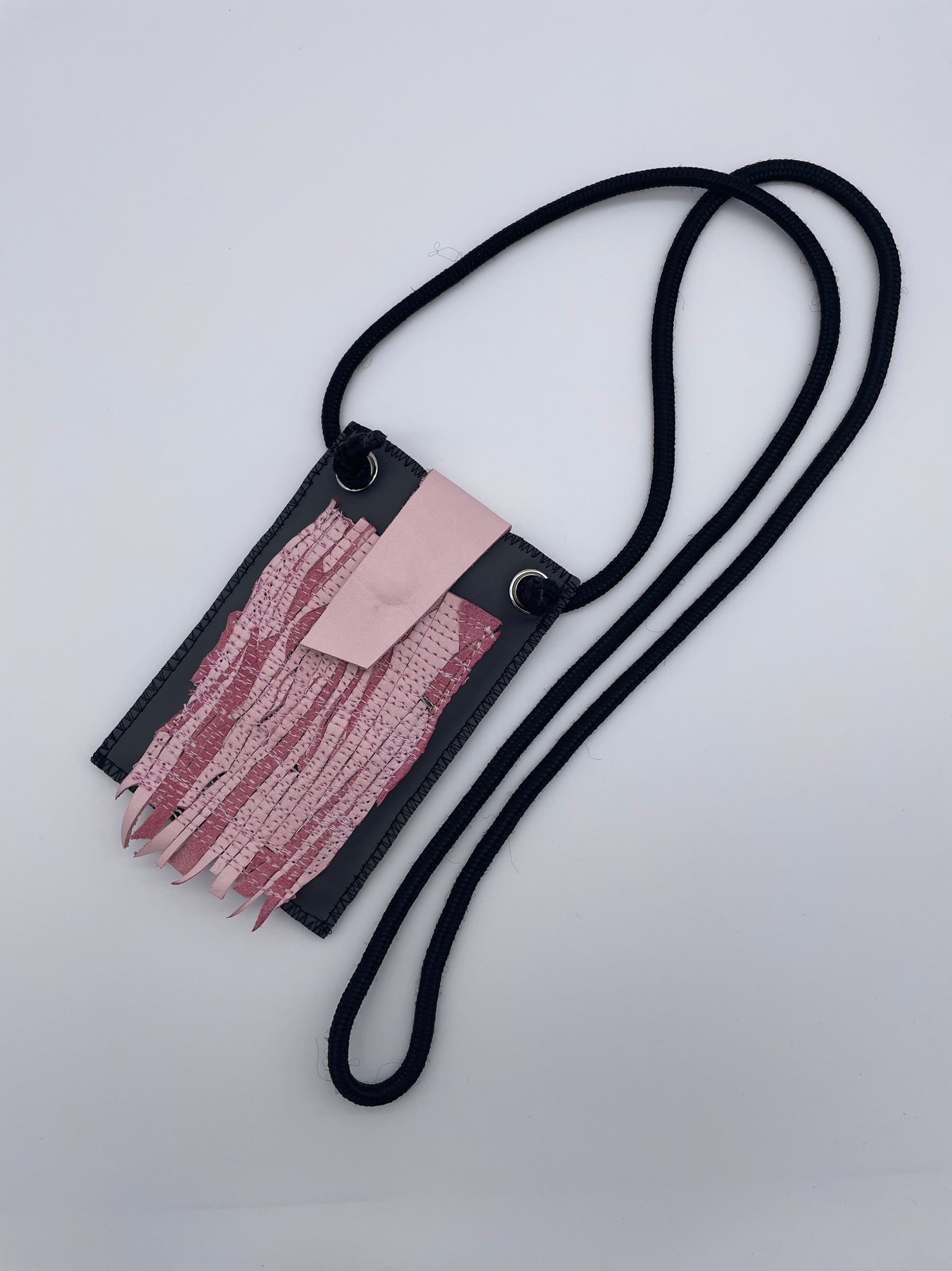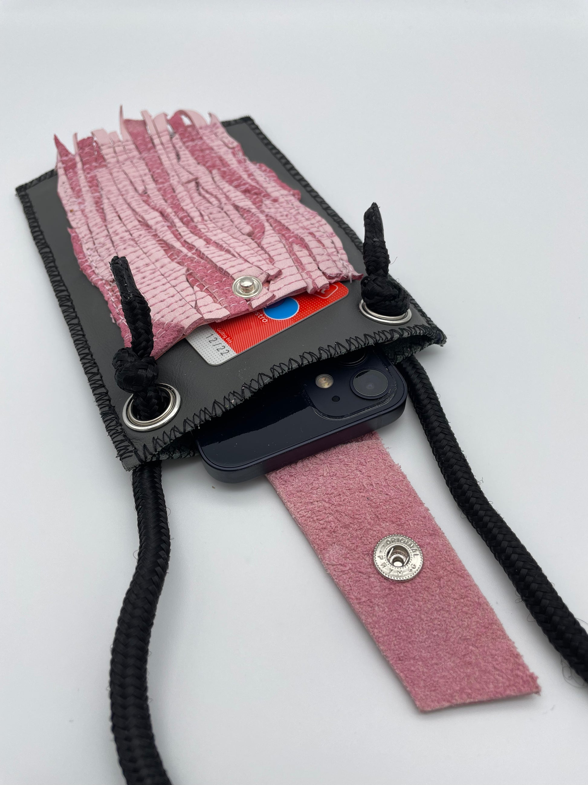 Upcycled Mini Sling phone case, zerowaste bag, out of deadstock upholstery black leather mixed with pink sustainable deadstock olive leather® scraps in a special zerowaste technique, an original prym push button as closure, adjustable upcycled cord to wear the bag crossbody or as neck pouch. The pink zerowaste on top is a card slot. Our mini sling comes with a black cord.