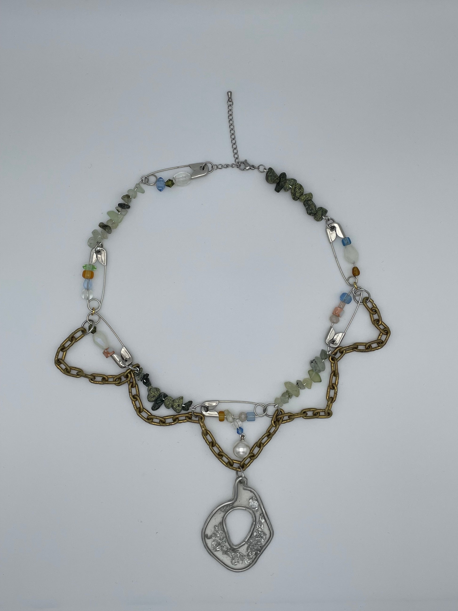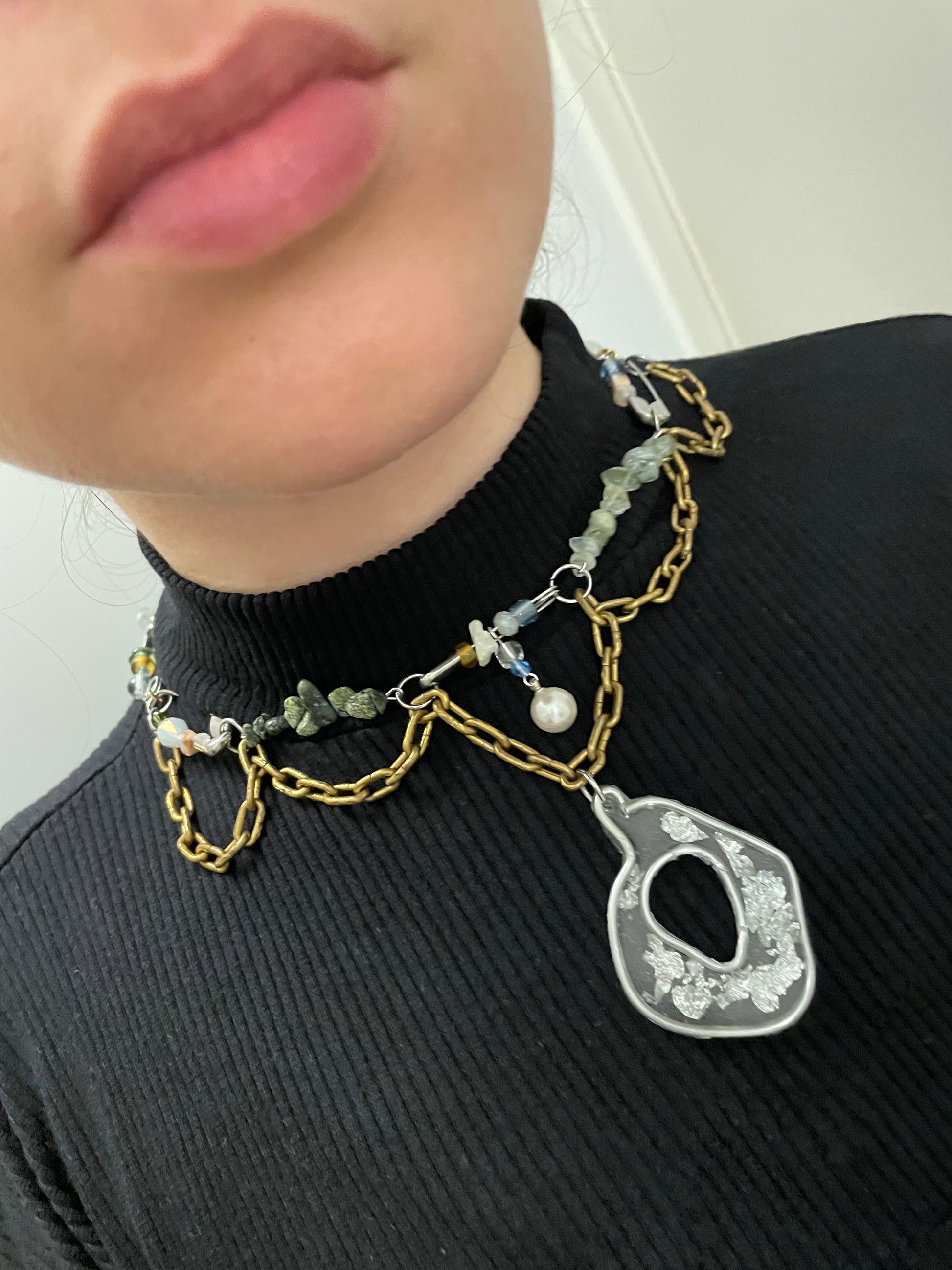Upcycled Olivia necklace is handmade out of leftover materials, with a handmade resin aluminum wire pedant and silver flakes. Mixed with rescued transparent vintage glass beads, stones, fresh water pearls and saftety pins. The necklace has an adjustable closure out of stainless steel.